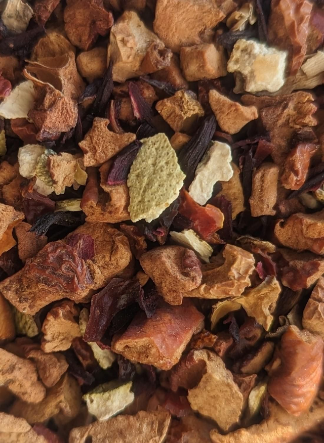 Ingredients: Apple pieces, hibiscus petals, rosehip and orange pieces natural flavours