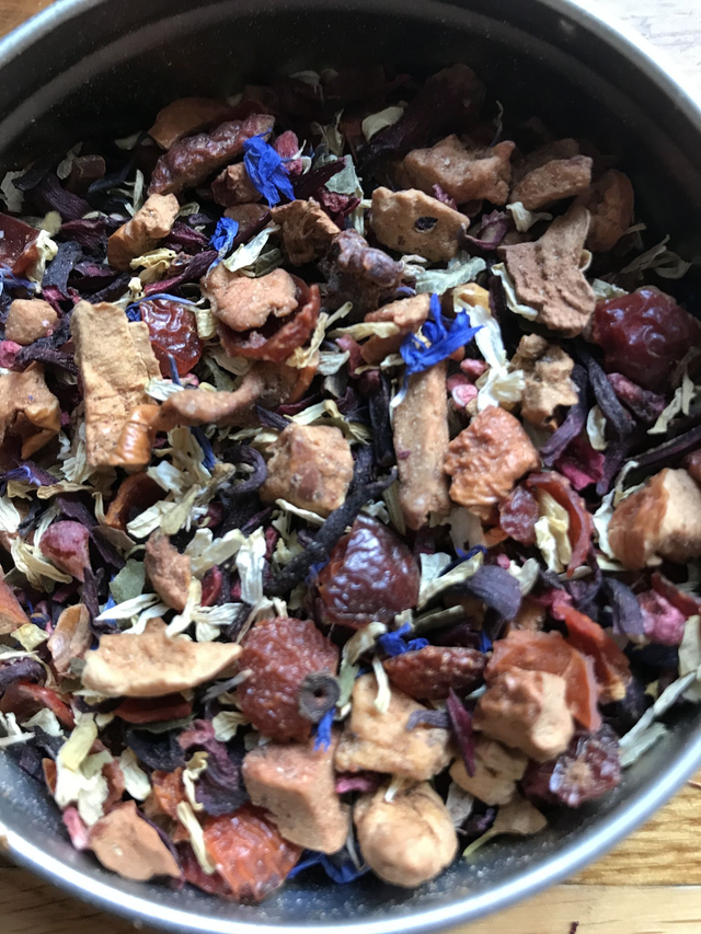 Ingredients: Apple pieces, Hibiscus petals, Rosehip pieces, Lemon peel, Camomile, Cornflower petals, Strawberry leaves, Raspberry pieces, Natural Flavours.